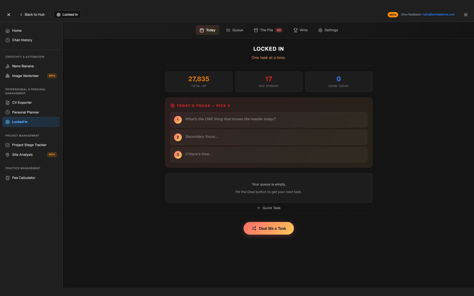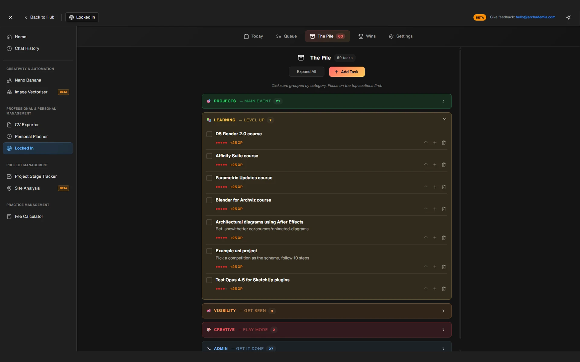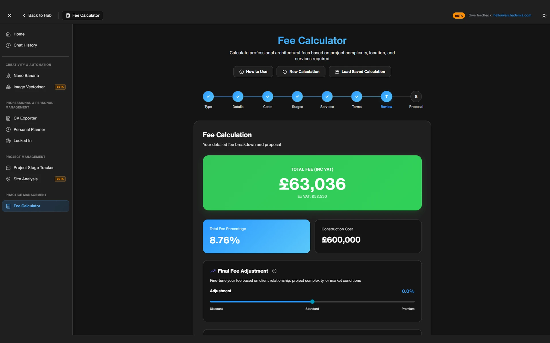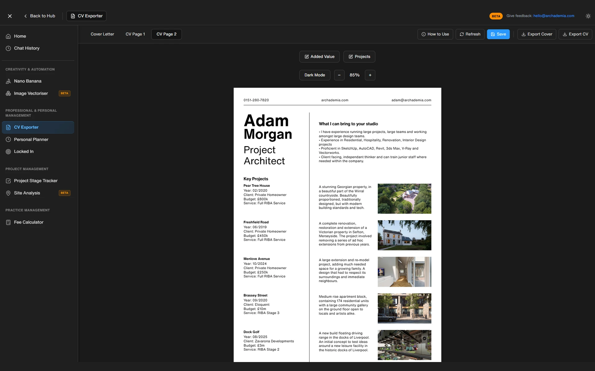 Generate rapid concepts. Track projects through every stage. Calculate fees, manage clients, and export polished CVs and portfolios. Plus custom-built software you won't find anywhere else.