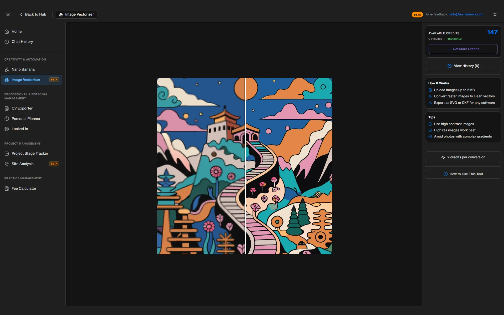 Convert your images into editable vector files ready for Illustrator. Perfect for turning renders and sketches into clean linework.